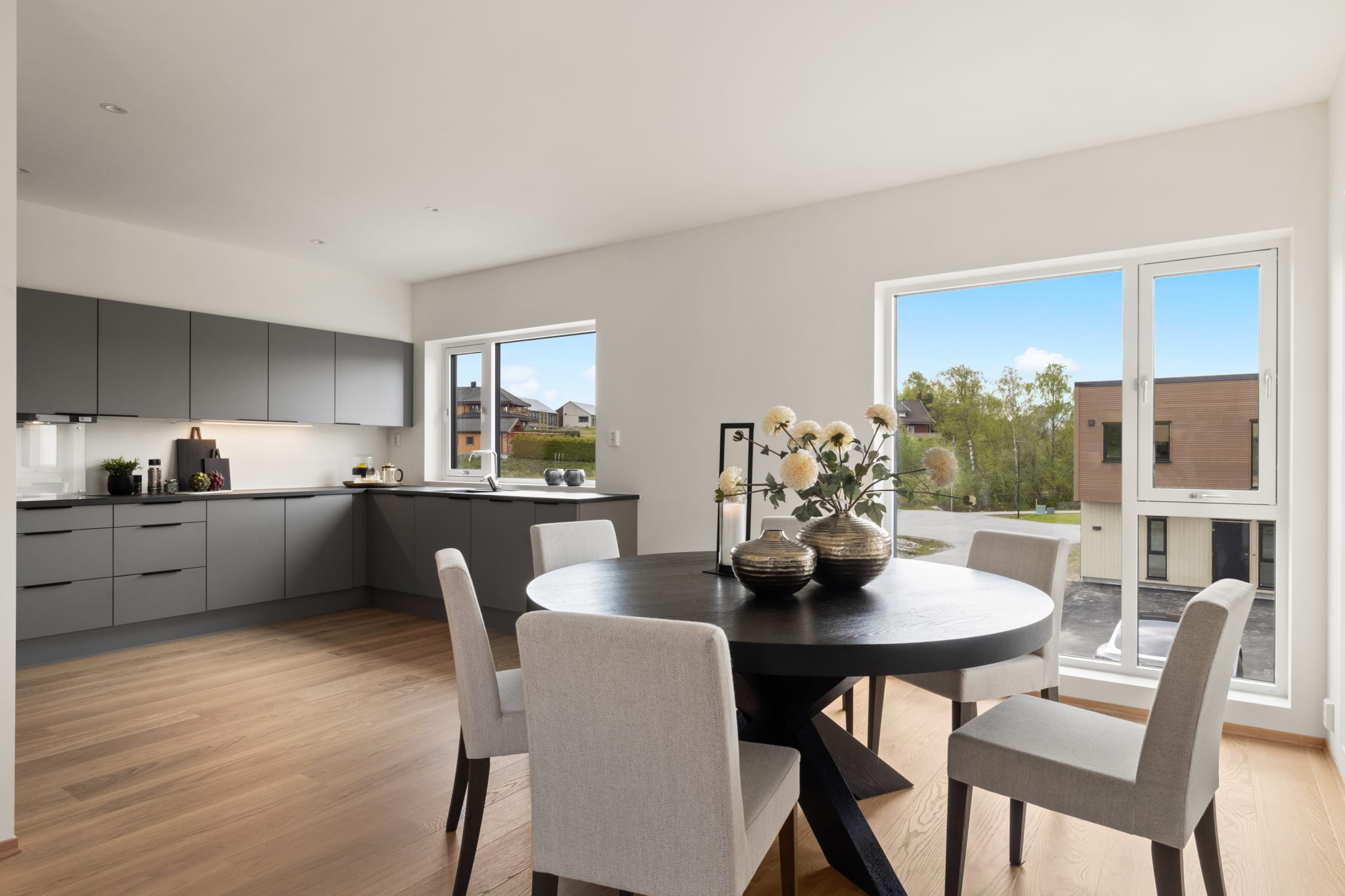 Det romslige kjøkkenet leveres i en elegant mørk grå matt farge, med rene linjer og integrerte hvitevarer. Praktisk plassert mot stue og spisestue, gjør det matlagingen til en naturlig del av hverdagslivet.